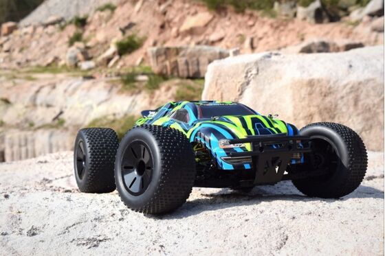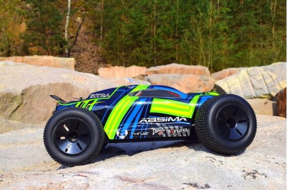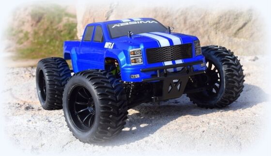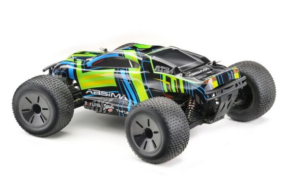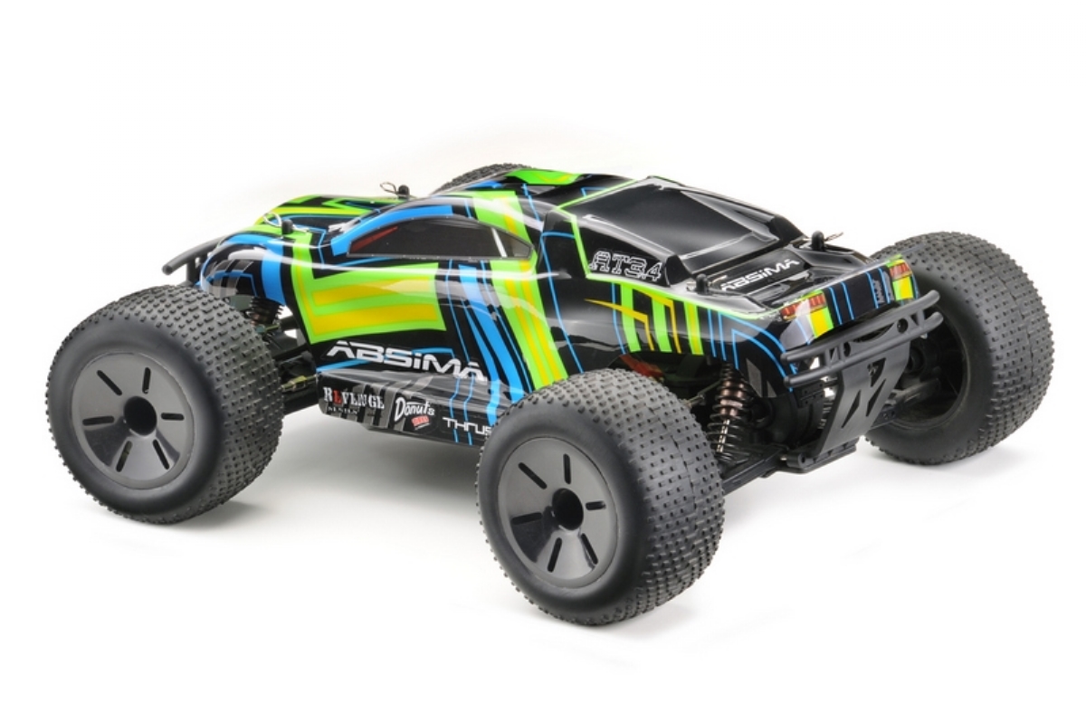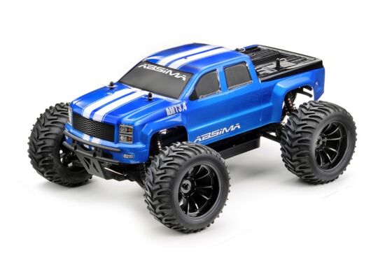 "UNBELIEVABLE POWER - the new Hotshot 3.4BL series is equipped with a powerful brushless electric motor and waterproof electronic speed controller (ESC). Shaft driven 4WD provides you with the necessary traction to maneuver the toughest obstacles and the forward/reverse ESC is beneficial in navigating tight spots. Lightweight plastic chassis, four oil filled adjustable coil over shocks, and independent suspension offer solid performance. Fear not! A 2.4GHz radio system and waterproof electronics ensure control, for those who dare to unleash the power. HIGHLIGHTS: Water-resistant 50A BL Speed Controler (programmable) Powerfull 3300KV BL Motor 2.4GHz A.F.H.D.S. Radio System 8 pcs. Full Aluminum Shocks Steel Motor Transmission GENERAL CHASSIS FEATURES: 4WD Complete ball bearing 8 pcs. adjustable aluminum oil shocks Gear differential front/rear Aluminum motor mount Complete covered transmission New chassis layout for better performance Adjustable turnbuckles Adjustable wishbones Aero disc racing wheels Full printed body Sticker sheet for a unique design A lot tune-up parts available! TECHNICAL SPECIFICATION: Measure (L/W/H): 425x300x200 mm Weight: 1850g Wheelbase: 270 mm Chassis clearance: 55 mm Tire width: 57 mm front / 57 mm rear Tire Ø ± 116 mm Shock spring force: medium / Length: 95mm f/r Differential oil viscosity: 1.000 front / 3.000 rear Shock oil viscosity: 400 f/r Steel Motor transmission: Pinion 21T / Gear 64T Pinion module: 0.6 MORE FEATURES: BL Speed Controller (2110007): programmable (brake power, neutral brake, drive mode, punch, V cut-off) / NiMH (7.2V) & LiPo (7.4V/2S) suitable / Amps: 50A cont./300A peak / BEC 6V/3A / Overheat cut-off / Drive function: front/reverse/brake (standard) / Plug system: T-plug (Deans style) Servo (2030003): 4kg steering force / 25T outdrive Motor (2130005): 3300KV / 27.400RPM @ 7.4V / Operating voltage: 4.8 - 11.1V / Size: 540 Radio (2000001): 2-channel radio / 3-channel receiver / reverse / dual rate / trimming SCOPE OF DELIVERY: Monster Truck ""AMT3.4BL"" RTR - brushless version 2.4GHz Radio System Manual Sticker Sheet REQUIRED ACCESSORIES: Battery - Racing Pack NiMH or LiPo (recommended) Charger"