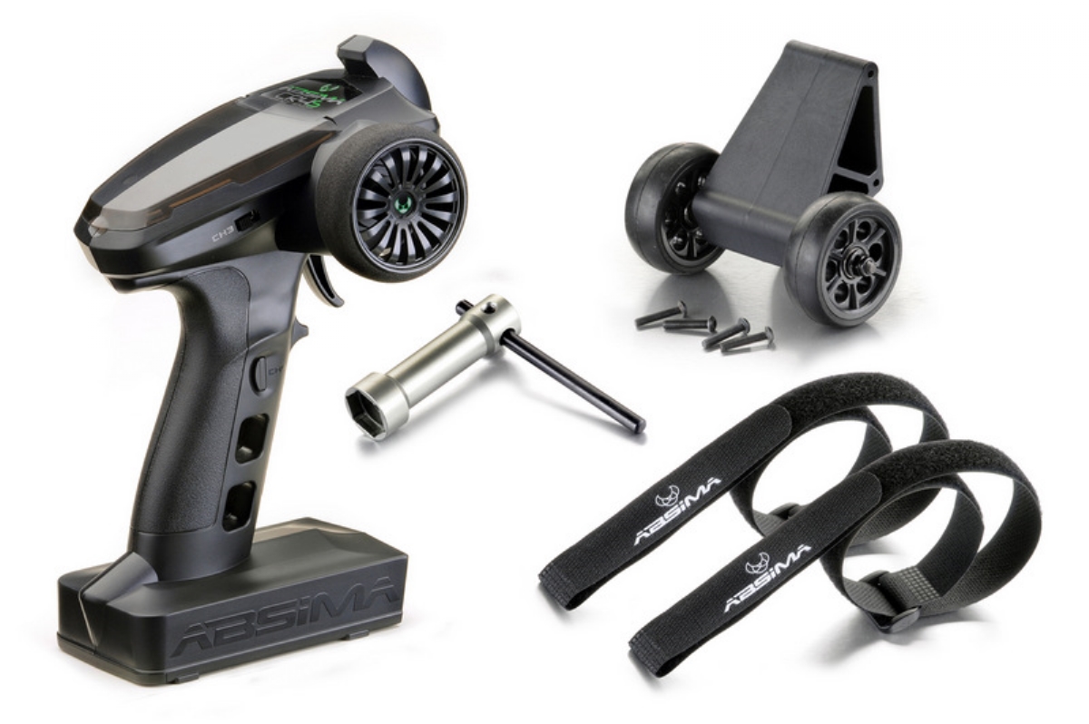 Die im Lieferumfang enthaltene ABSIMA CR4S 4-Kanal Fernsteuerung inklusive R4WP-Micro Empfänger verfügt über ein Moosgummi-Lenkrad sowie über einen „Beginner-Modus“ welcher die Motorleistung auf 50% reduziert. Außerdem stehen Dir noch 2 weitere Kanäle zur Verfügung um beispielsweise die separat erhältliche mechanische Handbremse anzusteuern.