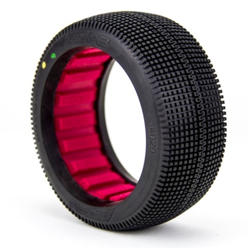 AKA is proud to announce the release of the ZIPPS 1:8 buggy tire. The ZIPPS tire has been designed with durability and stability in mind for today's high wear and high grip tracks. The ZIPPS features a very dense symmetrical block tread pattern with a center staggered rib. The dense block pattern puts as much rubber on track as possible while still allowing dust to clear from the tire patch. This enables superior wear and stability while remaining controllable off line in the dust. The center rib decreases rolling resistance on the straights and creates a very stable platform in the center of the tire. We have also updated our block design to allow for more deflection. This allows the block to flex a bit more front to rear to gain forward bite while still remaining stable side to side. The ZIPPS tire will be available in Soft, Super Soft, Long Wear Soft and Long Wear Medium compounds.