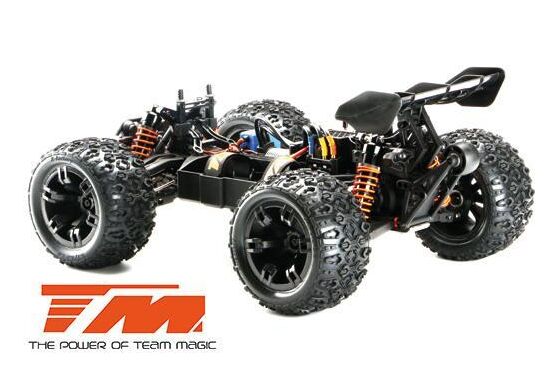 Um den Team Magic E5 HX zu schaffen, hatte Team Magic die Idee einen 1:8 Racing Monster Truck in Klein zu konstruieren. Die Widerstandsfähigkeit und die Kraft eines 1:8 Racing Monsters wurde mit der Agilität und Beschleunigung sowie dem schnellen Handling eines 1:10 Modells kombiniert. Zudem wurden einige neue Besonderheiten hinzugefügt. Der E5 HX ist der derzeit schnellste und stärkste 1:10 Racing Monster auf dem Markt. Der vordere Rammer ist mit drei weissen und zwei roten hellen LED's ausgestattet. Der Team Magic E5 HX beinhaltet eine schön geformte Racing Monster Karrosserie aus widerstandsfähigem Polycarbonate-Lexan um die innenliegenden Komponenten zu schützen. Robuste 14mm Radadapter helfen die hohe Kraftübertragung auf die griffigen K-Factory Reifen zu gewährleisten. Dies sorgt für bessere Fahreigenschaften und schnellere Beschleunigung auf allen Untergründen. Desweiteren ist ein einstellbares, robustes Wheelie-Bar (Stützrad) am hinteren Ende des Modells angebracht. Für eine bessere Kontrolle der Wheelies (Wheelie = auf zwei Rädern fahren), verfügt der Team Magic E5 HX über ein kugelgelagertes Wheelie-Rad. Sie werden es lieben! Alle Plastikkomponenten sind aus hochqualitativem faserverstärktem Material was dem Team Magic E5 HX neben einer höheren Stabilität auch weniger Tweak (Verwindung) und damit eine bessere Geometrie und Getriebeeffizienz verleiht. Die vorderen und hinteren Schwingen sind symetrisch, was die Kosten für Ersatzteile senkt. Antriebswellenknochen gehen immer verloren und haben einen hohen Verschleiss - das ist der Grund wieso der Team Magic E5 HX vorne mit qualitativen CVD Antriebswellen ausgestattet ist. Bereits aus der Verpackung heraus hat der Team Magic E5 HX einstellbare Rechts-Linksgewinde sowie einen einstellbaren Servo Saver. Um grosse Sprünge und Unebenheiten besser zu absorbieren, verfügt der E5HX über grossvolumige Öldruckstossdämpfer sowie eine lange Aufhängung. Siehe das hintere Ende - drücke es herunter!... hier gibt es einen aktive Vorspur welche beim Landen und Beschleunigen für mehr Kontrolle sorgt. Das Team Magic E5 HX Fahrgestell verfügt über einen Multi-Anschluss-Stecker welcher die Möglichkeit gibt, die Elektronik schneller zu wechseln. Weniger Kabelsalat im Modell dank Kabel-Tunnel. Ihre 3-4s Akkus werden durch eine Schnellwechselakkuhalterung befestigt. Ein neuer Schmutzfilter auf dem THOR Regler schützt den Ventilator vor Schmutz und Wasser. Team Magic hat die besten Elektronikkomponenten ausgewählt, welche derzeit am Markt erhältlich sind! Ein 15kg starkes, wasserfestes, metallgetriebenes SAVOX Servo ergibt höchste Präzision in jeder Situation. Siehe - der wasserfeste Empfänger ist in der wasserfesten Empfängerbox. Der 120Ampere starke THOR Fahrtenregler und der 3500kv 3660er THOR Motor macht den Team Magic E5 HX zu einer Rakete. Um diese Kraft zu bändigen und den E5 HX noch robuster zu machen, verfügt der E5HX 1:8 über ein Stahlgetriebe Modul 1.0 und eine 5mm Motorwelle. Fahre eine Rakete - wähle den Team Magic E5 HX! Technische Daten: - Länge 428mm - Breite 343mm - Radstand 270mm - Gewicht 2.7kg - Reifendimension 5.1x3.25x2.75 - Regler wasserfest 120A, 3-4s Lipo, XT90 - Motor 3660 brushless 3500kv - Verzahnung M1.0 Stahlgetriebe - Getriebe Mittelwelle 4wd - Big Bore Oeldruckstossdämpfer - Schmutz&Wasserfilter - Transmitter 2.4ghz - 15kg wasserfestest Savox Servo m. Metallgetriebe - 4 Leds vorinstalliert - Easy Access Verteilerplatine - Schnellwechselhalterung für Akkus - einstellbares Wheelie Bar (Stützrad) - K-Factory Reifen - MAX Speed 60km/h* @ 2s - MAX Speed 85km/h* @ 3s - MAX Speed 95km/h* @ 4s *with optional parts Benötigt: 1 St. LiPo-Akku, 1 St. Ladegerät, 4 St. AA-Alkalibatterien. Empfohlen: HRC9356C, HRC9354A, HRC9362B, HRC9361C, HRC02348X, HRC04457X, HRC06462X, HRC06446X9