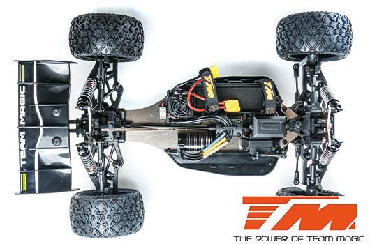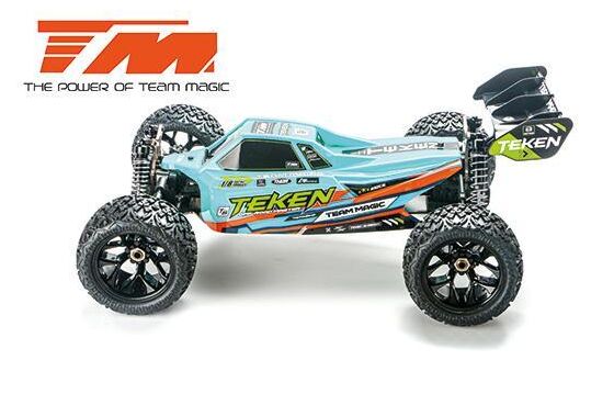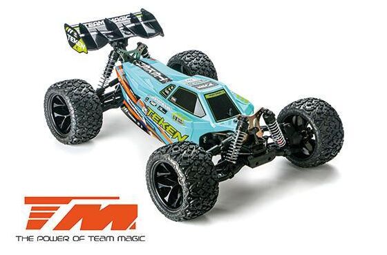 Der allradgetriebene TEKEN Truggy von Team Magic im Maßstab 1:8 XL wird von einem wasserdichten elektronischen 100A-Regler in Kombination mit einem 2500 KV High-Speed-Motor angetrieben. Ein 16 kg schweres Metallzahnradservo sorgt für die stärkste Lenkung. Alle elektronischen Komponenten sind wasserdicht (spritzwassergeschützt). Die Grundplatte ist aus 3 mm dickem, ultraleichtem Aluminium gefertigt. Sie enthält drei Differentialgetriebe, die mit CNC-gefrästen Kegelrädern ausgestattet sind, um die Kräfte zu absorbieren und eine perfekte Kraftverteilung für jedes Rad zu gewährleisten. Dazu gehören Stoßdämpferbrücken aus Aluminium und Stoßdämpfer aus Aluminium. Fahrwerksversteifungen reduzieren unerwünschte Verwindungen des Chassis während der Fahrt. Radstand, Sturz und Nachlauf können mit Gewindestangen vollständig eingestellt werden. Hochleistungsreifen bieten eine bessere Traktionskontrolle und eine längere Lebensdauer. Die Karosserie des TEKEN Truggys besteht aus robustem Lexan (Polycarbonat) und ist perfekt auf einen großen Heckflügel mit hohem Abtrieb abgestimmt, der das Fahrzeug bei hohen Sprüngen in der Luft stabil hält. Der TEAM MAGIC TEKEN truggy wird für Piloten empfohlen, die ein Modell wollen, das kontrolliert und wendig zu manövrieren ist. Spezifikationen: Länge: 576mm Breite: 410mm Höhe: 210 mm Radstand : 386mm Bodenfreiheit : F :45mm / R : 50mm Gewicht : 3900g Eigenschaften: Spritzwassergeschützter 100A Fahrtenregler 14.8V bürstenloser Motor 2500KV 16KG Metallgetriebe Servo Wasserdicht 3mm Alum. Chassis Alum. Motorhalterung 26T/8T CNC-gefräste Kegelräder 3-Gang-Differentiale Langlebige Antriebswellen Alum. Stoßdämpfertürme Alum. Einstellbare Stoßdämpfer Chassis-Versteifungen 17mm Sechskant-Radadadapter Einstellbare Stangen Hochwertige Kugellager Hochleistungs-Geländereifen Empfängerbox Elegante Karosserie Höchstgeschwindigkeit 80 km/h aus der Packung Benötigtes Zubehör (3-4S 100A ESC): 4 AA Batterien für den Sender Ladegerät (Empfohlen Star Charger v. HRC RACING) LiPo Akkus mit XT90 Stecker (Empfohlen Hardcase von HRC RACING HRC02258X, HRC04457X, HRC04469X, HRC04462X) Der Regler verfügt über Anschlüsse für 2 Akkus. Um den Betrieb mit einem Akku zu gewährleisten wir ein Loop Adapter benötigt (Empfohlen HRC9199Y). Normalerweise wird mit 2x 2S LiPo = 4S gefahren.