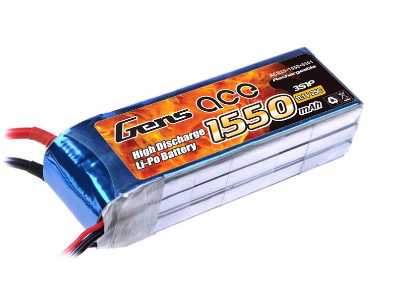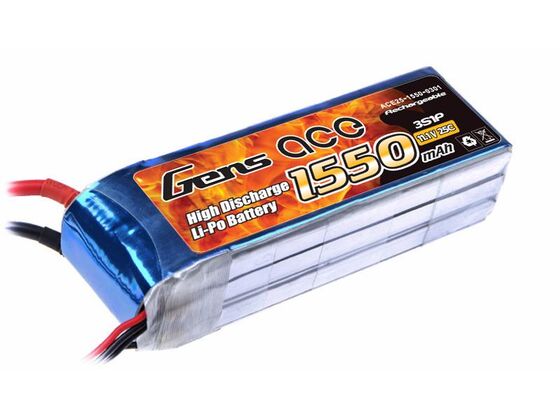 Gens Ace, Bateau, Multicopter, Avion, Helicoptère, Kapazität: 1550mAh, T-Plug, 5C, Ladung Maximalstrom (A): 7A, Entladung (Dauerstrom): 38A, Entladung (Maximalstrom): 76A, 25C, Höhe: 24mm, Breite: 31mm, Länge: 91mm, Gewicht: 135g, 3S - 11.1 LipoV, Softcase, Lipo