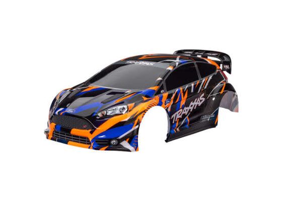 Body, Ford Fiesta ST Rally VXL, orang e (painted, decals applied) (assemble d with rear wing, body support, & bod
