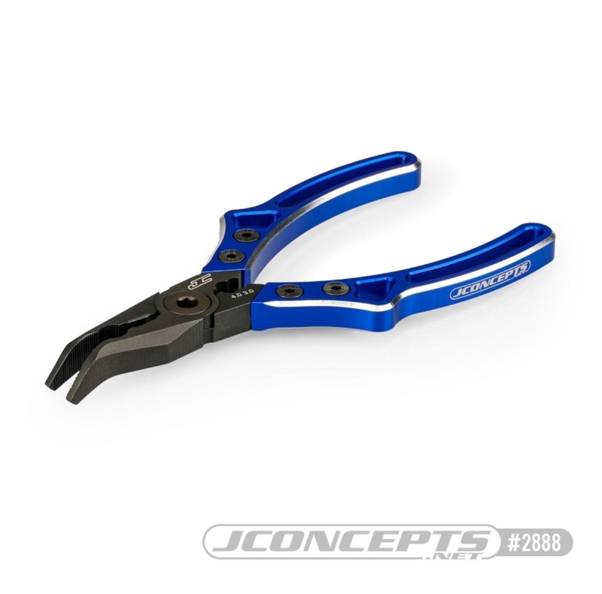 Im Griffbereich befindet sich eine Öffnung, in der runde Gegenstände gegriffen und eingeklemmt werden können, um sie weiter zu bearbeiten. In der Nähe des Drehpunkts ist ein Innenschneider eingebaut, mit dem man seitlich schneiden kann, um kleine Plastikteile von Bauteilen zu lösen oder einfach weiche Metalle, Lot oder andere Materialien mit geringem Widerstand zu schneiden. Hinter dem Drehpunkt hat die JConcepts-Zange die handlichen Durchmesser 4,0 und 3,0, die zum Einklemmen von Stoßdämpferwellen während des Auf- oder Umbaus dienen, ohne unnötig wichtige Oberflächen zu markieren.