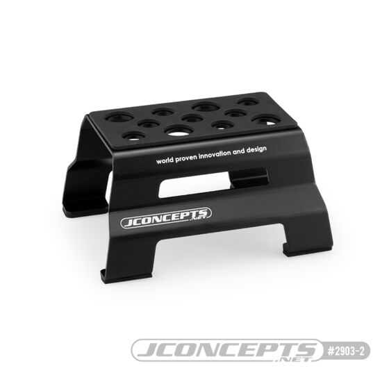 Robuste Fahrzeuge verdienen einen robusten und langlebigen Ständer für den Boxenbereich, egal ob auf der Rennstrecke oder zu Hause. Der JConcepts Metall-Fahrzeugständer ist perfekt für 1/8 oder 1/10 Rennfahrer, die ihrem Rennprogramm etwas mehr Robustheit verleihen wollen. Das von JConcepts entworfene, aus Aluminium geformte und geschnittene Teil hat eine einzigartige Form, Aussparungen für Griffe und verfügt über lasergravierte Logos zur Identifikation. Das Teil steht hoch und hält die Räder für eine Reihe von Fahrzeugen vom Boden fern.