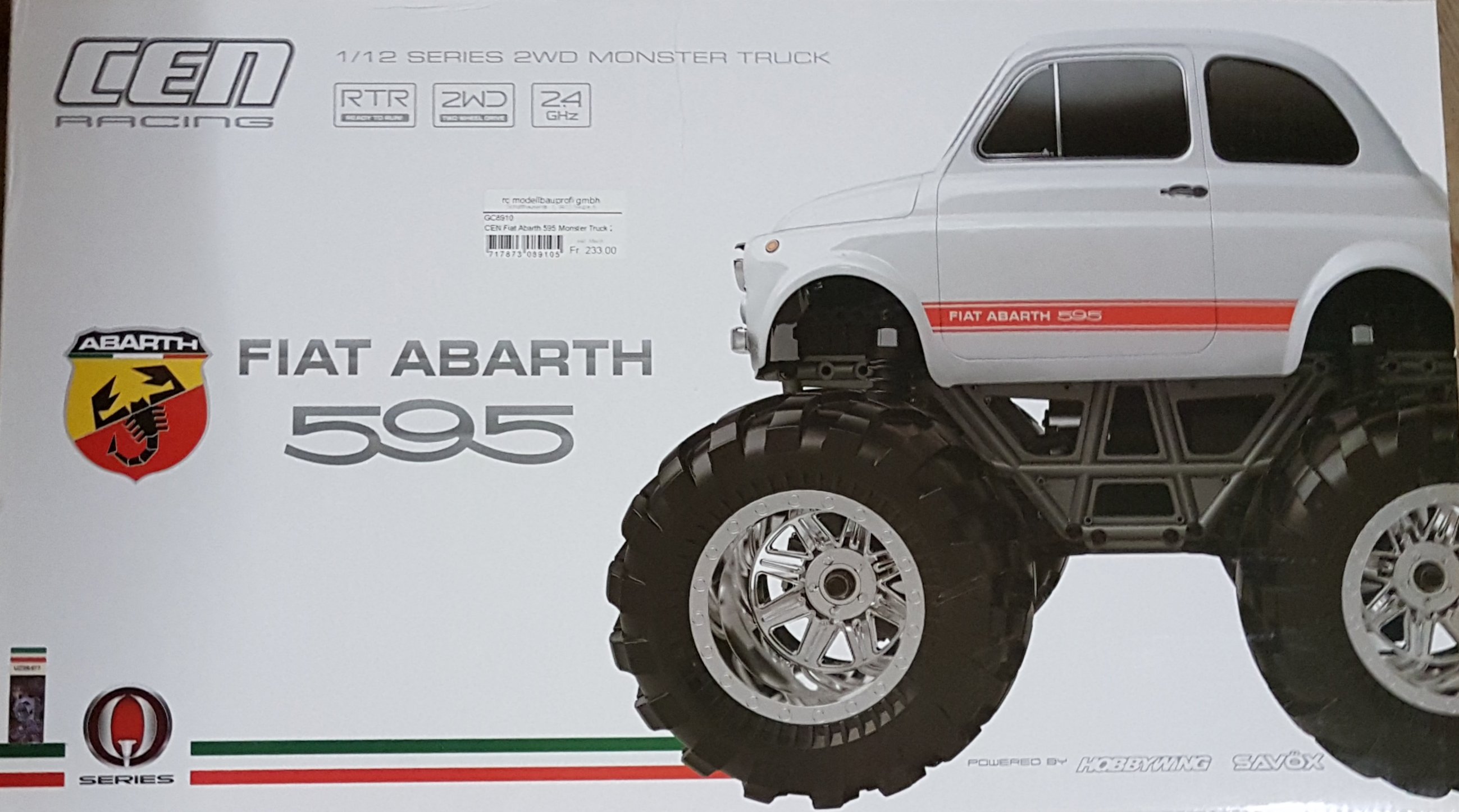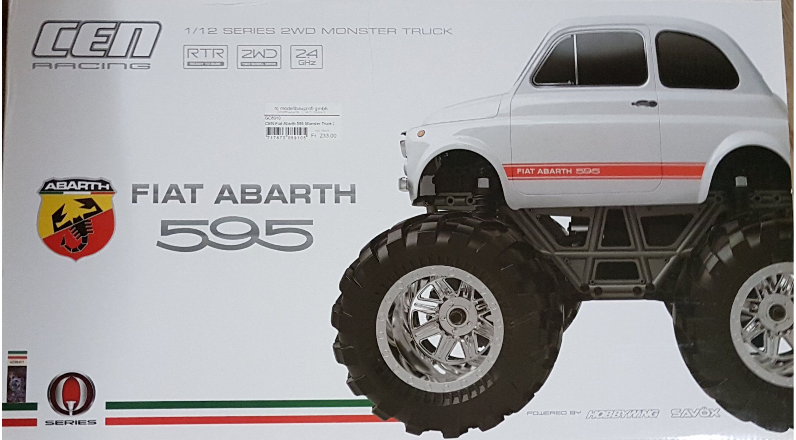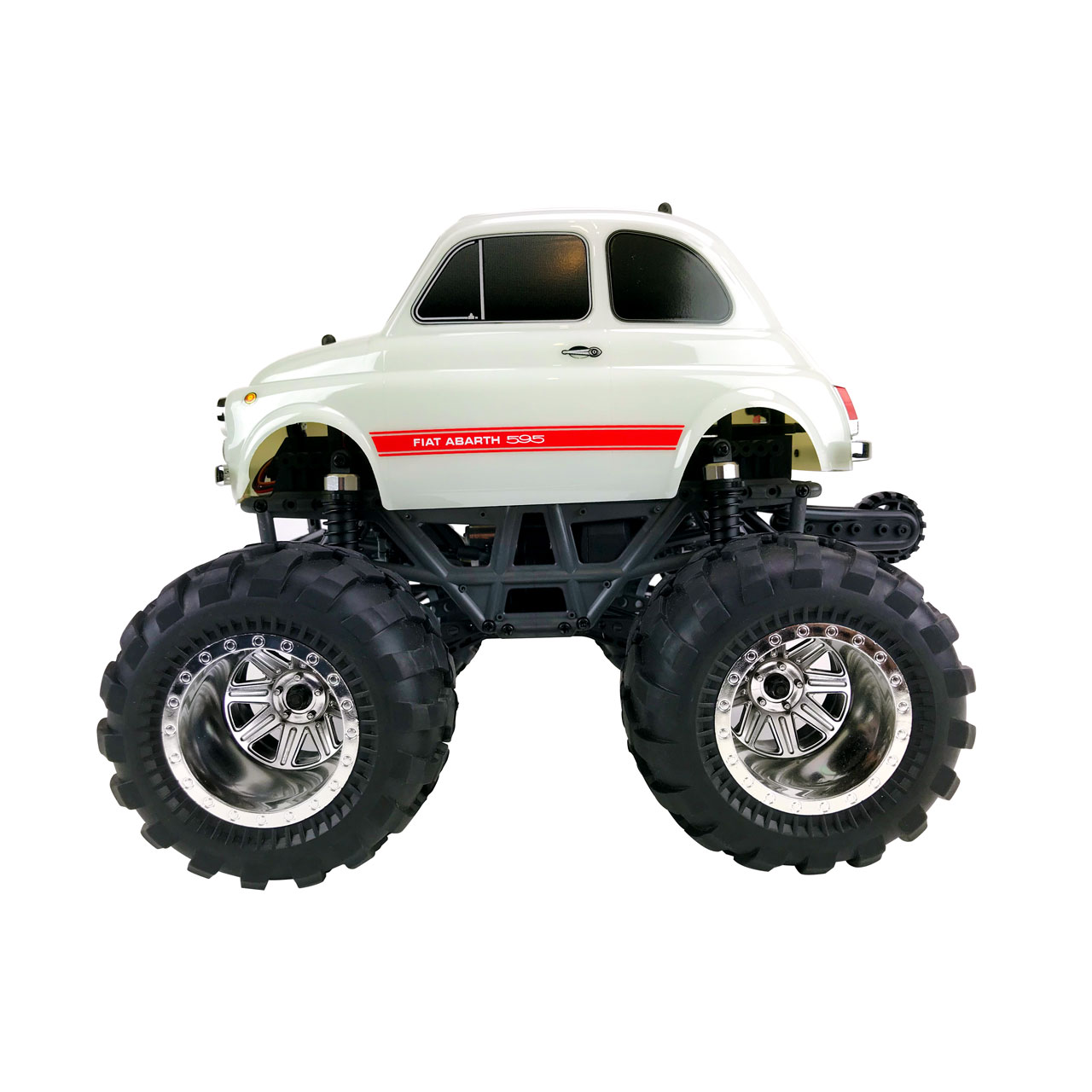 Das Aussehen des legendären Fiat ABARTH 595 auf einem mächtigem Monster Truck Chassis ergibt eine einzigartige, ausgefallene Kombination. Die Karosserie ist ein Highlight und dem Vorbild in vielen Details wie verchromte Stoßstangen, Scheinwerfer und Lackierung ebenbürtig. Die im Maßstab 1/12 gehaltene RTR Version hat 2WD Antrieb. 4-Link Aufhängung der Achsen mit Öldruckstoßdämpfern sorgen in Verbindung mit den große Monster Truck Reifen für ein mächtiges Erscheinungsbild.