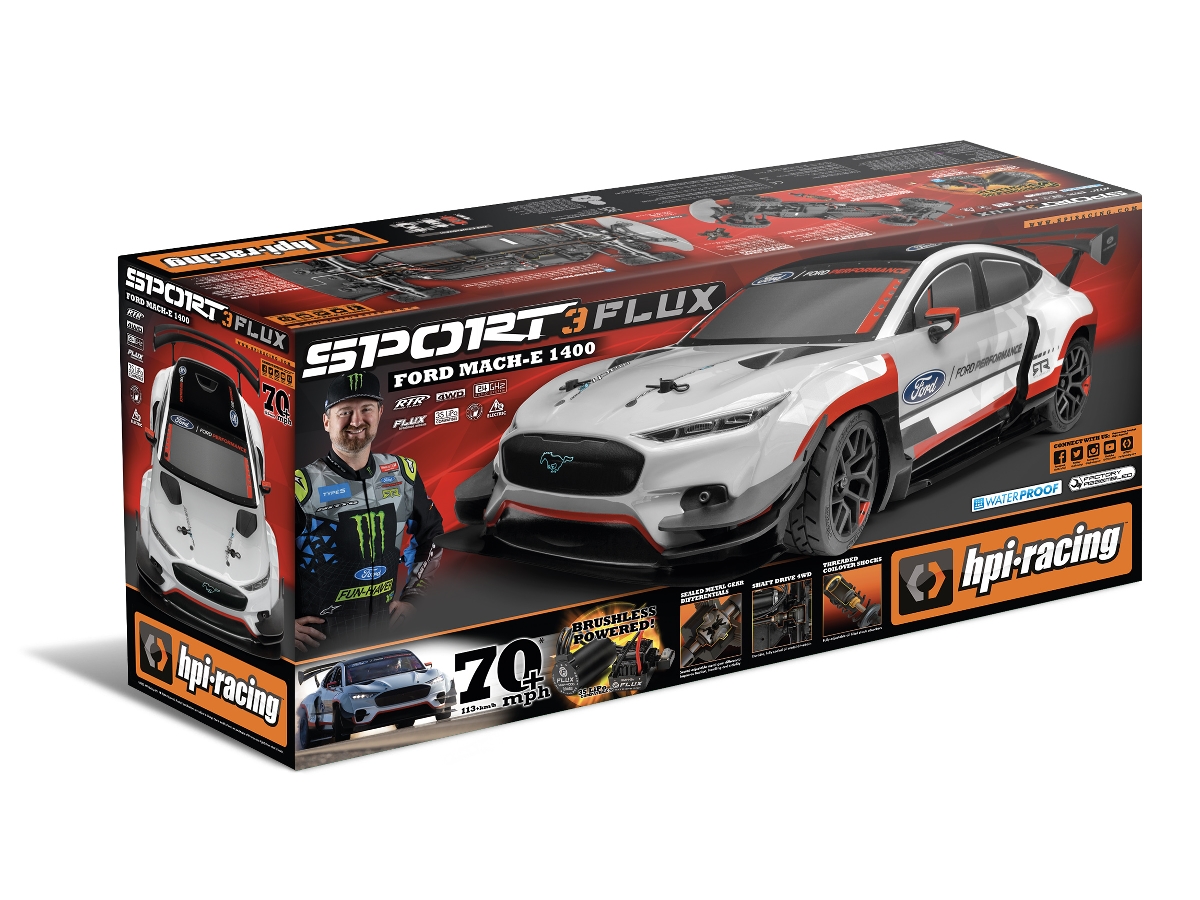 Unter der Haube ist der Ford Mustang Mach-E 1400 im Maßstab 1:10 mit dem neuesten HPI Racing Touring Car Chassis ausgestattet, dem Sport 3 FLUX! Mit einem voll versiegelten 4WD Antrieb, bürstenlosem Motor, wasserdichter Elektronik und 2.4GHz Funkübertragung, voll unabhängiger Doppelquerlenkeraufhängung und einstellbaren, ölgefüllten Stoßdämpfern ist der Ford Mustang Mach-E 1400 in jeder Situation bereit zu rocken - und die HPI FLUX Power bedeutet, dass er jede Menge Power für 4-Rad-Drifts und atemberaubende Geschwindigkeiten hat, wenn man den Abzug drückt!