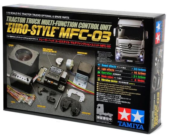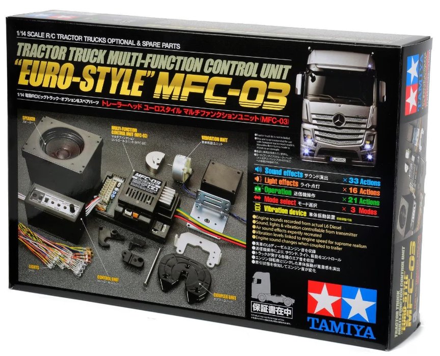 Die TAMIYA Multifunktionseinheit MFC-03 Euro-Style simuliert in LKW-Modellen nahezu alle Sound- und Lichtfunktionen der großen Vorbilder. Sie ergänzt mit dem an einem europäischen Reihensechszylinder-