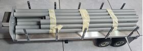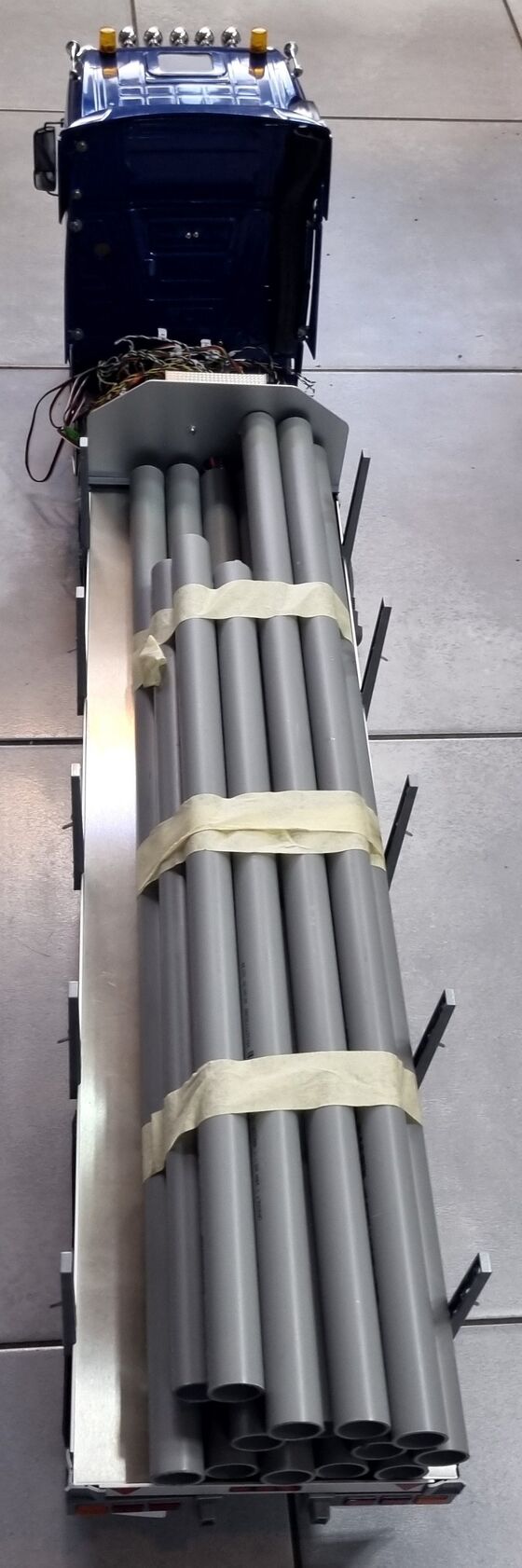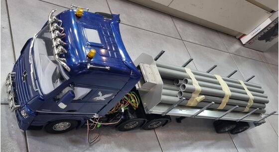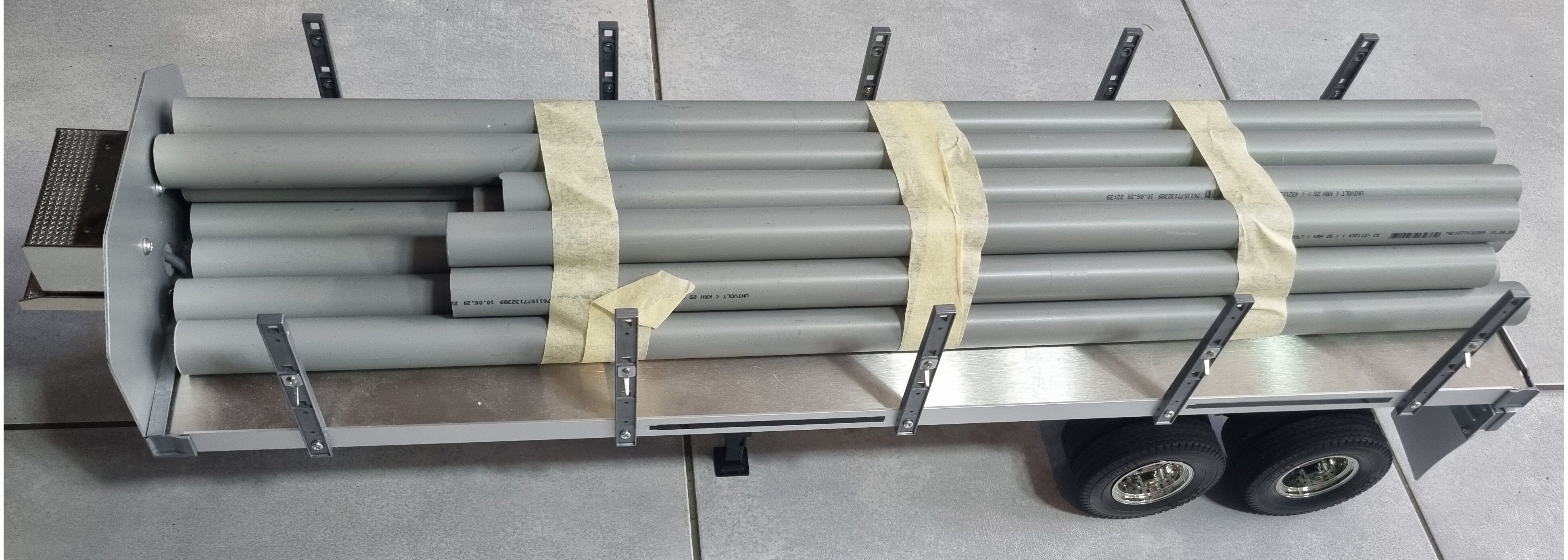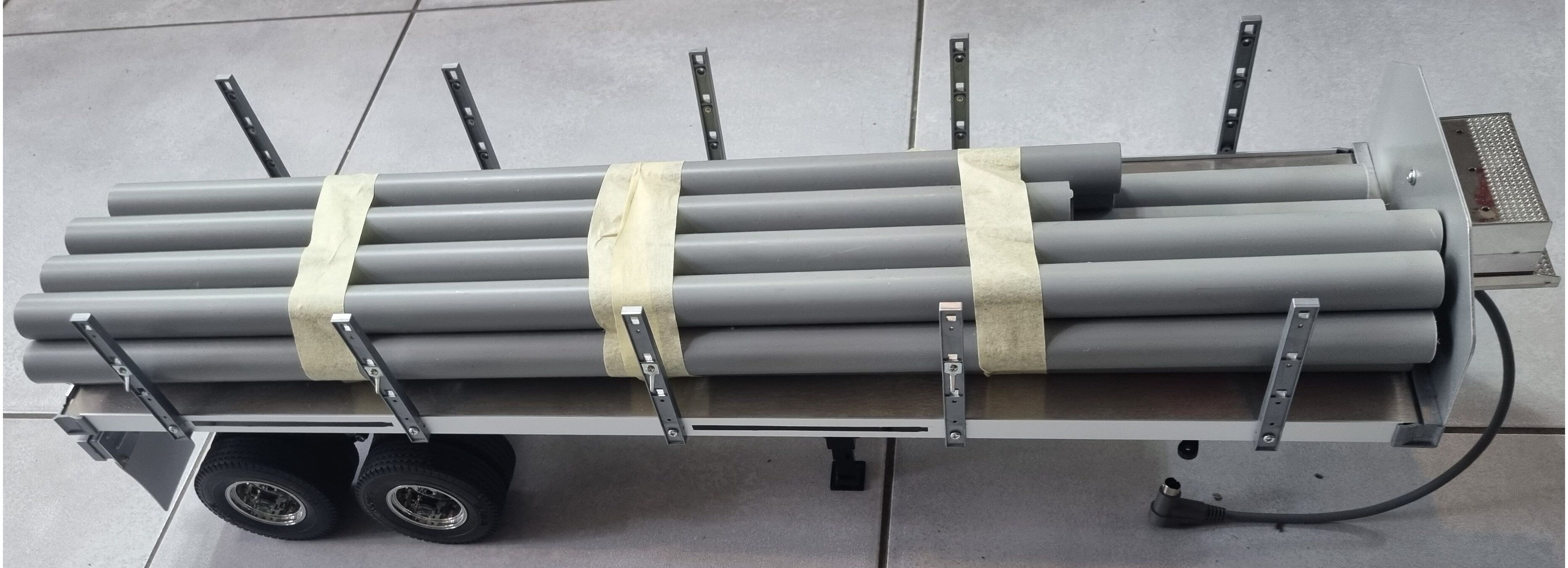 TAMIYA bietet das Modell eines Flachbett-Aufliegers an, der an RC-Sattelschlepper im Maßstab 1:14,5 angekuppelt werden kann. Die Verwendung von Aluminium für den Rahmen und das Fahrgestell sowie sie