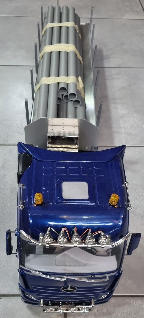 Mercedes Benz Actros 3363 Giga Space 6x4 Pearl Blue Edition Komplettset + Flachbett-Auflieger, LED-Lichtset & Kugellager