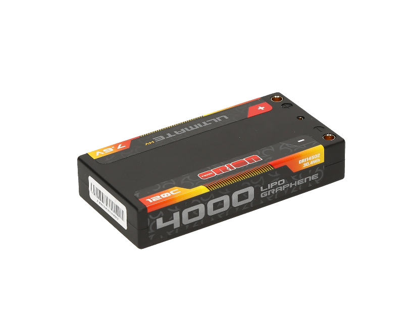 Team Orion – reigning 2wd and 4wd World Champions – proudly announce the new Ultimate Graphene LiPo competition batteries. The new Ultimate Graphene LiPo batteries represent the latest development in lithium battery technology, offering new levels of performance. Our engineers have worked closely with our team drivers to fine tune the performance of our Graphene LiPo batteries to make sure that the performance is optimal, no matter the track conditions. Thanks to the ultra low internal resistance and improved capacity, the new Graphene LiPo cells supply stable power, from the start to the end of the race. The Ultimate Graphene Lipo range is composed of two families of batteries, the Ultimate Graphene LiPo (7.4V) and the Ultimate Graphene LiPo HV (7.6V). The new batteries are available in the all the most popular formats, shorty, small shorty, stick and 4S block for 1/8.